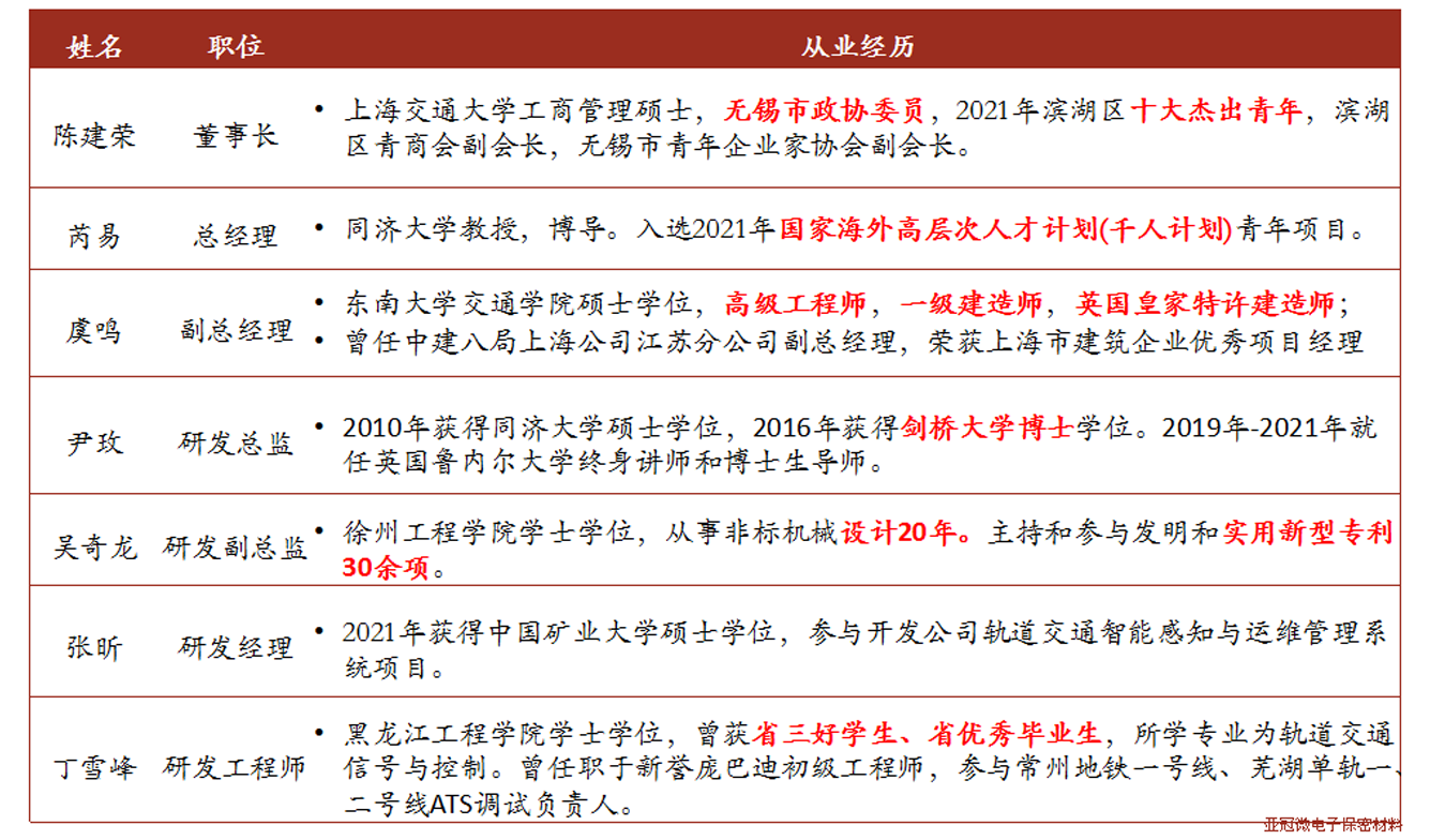 公司的创业合伙人及高管在轨道交通、物联网、大数据运营等领域有多年的研发、运营、管理经验。