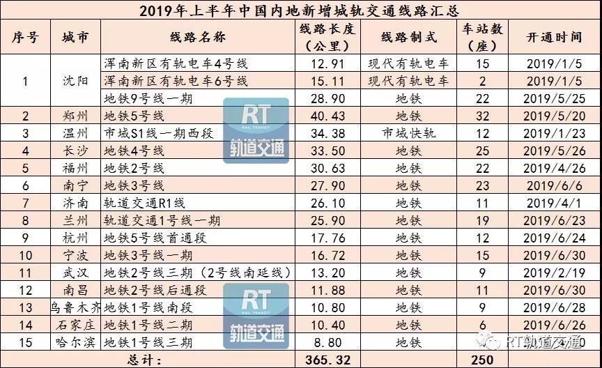 2019年上半年中国内地新增城轨交通线路详情全览